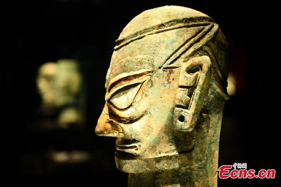 Photo taken on March 29, 2022 shows an exhibit at the Sanxingdui museum in Guanghan, southwest China's Sichuan Province. The construction of a new building of the renowned Sanxingdui museum began on Tuesday in the city of Guanghan, southwest China's Sichuan Province. The new building is located in the Sanxingdui museum park, with a total floor area of approximately 55,000 square meters -- five times the size of the museum's current buildings. (CNS/Zhang Lang)