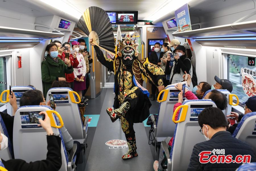 A performer stages Sichuan opera face changing show for passengers on a train in Guiyang, southwest China's Guizhou Province, March 30, 2022. (Photo: China New Service/Qu Honglun)