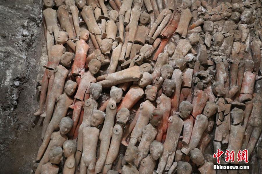 Jiang Village tomb is the tomb of Emperor Xiaowen of the Han Dynasty (202 BC-220 AD) and Empress Dou. In December 2021, archaeologists found a clay figure with torture tools in a pit outside the southwest corner of the tomb. It is the first time that a terracotta figure with torture tools has been unearthed in China. (Photo/VCG)