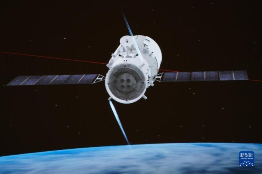 A simulated diagram shows China's Tianzhou-2 cargo craft entering the Earth's atmosphere under ground control at 6:40 p.m. Beijing Time, March 31, 2022. (Photo/Xinhua)