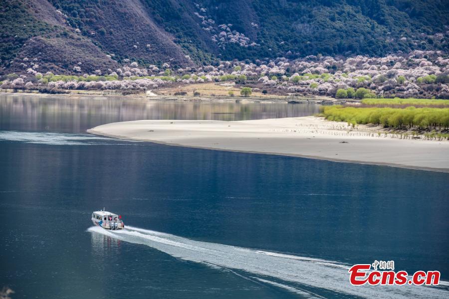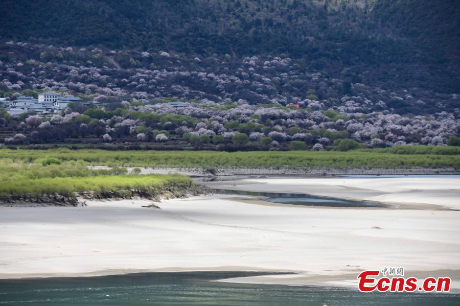 Peach flowers are in full blossom along the Nyang River in Nyingchi, southwest China's Tibet Autonomous Region. March 31, 2022. The Nyang River is one of the major tributaries of the Yarlung Zangbo River. (Photo/China News Service)
