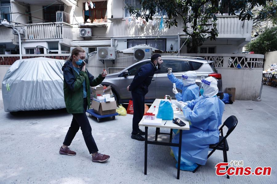 Medical workers take swab samples from residents for nucleic acid tests at a community, Shanghai, east China, April 6, 2022. (Photo: China News Service/Yin Liqin)
