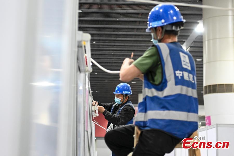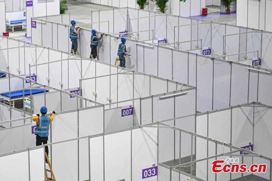 Construction workers work at Pazhou International Convention and Exhibition Center, Guangzhou, south China's Guangdong Province, April 10, 2022. Guangzhou is building a makeshift hospital at its Pazhou exhibition center (Photo: China News Service/Chen Jimin)