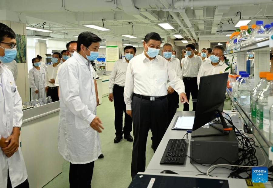 Chinese President Xi Jinping, also general secretary of the Communist Party of China Central Committee and chairman of the Central Military Commission, visits a research institute of the Ocean University of China to learn about the development of marine science and technology in Sanya, south China's Hainan Province, April 10, 2022. Xi on Sunday inspected the city of Sanya, south China's Hainan Province. (Xinhua/Yan Yan)