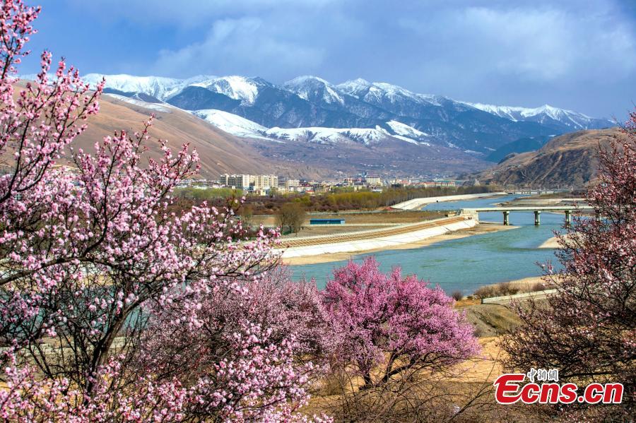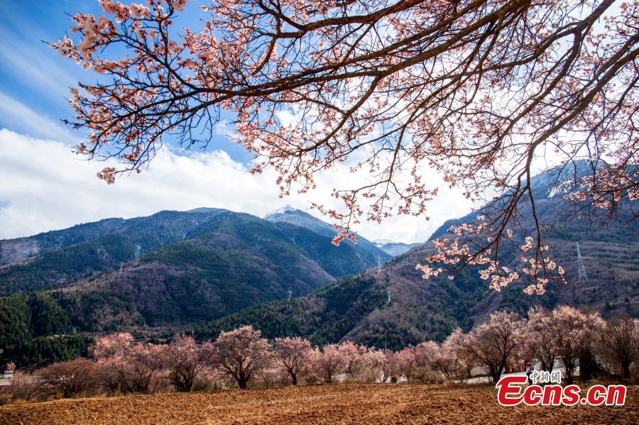 Beautiful Tibetan village decorated with pink apricot blossoms is seen in Ganzi Tibetan Autonomous Prefecture, southwest China's Sichuan Province. (Photo: China News Service/He Xingming)