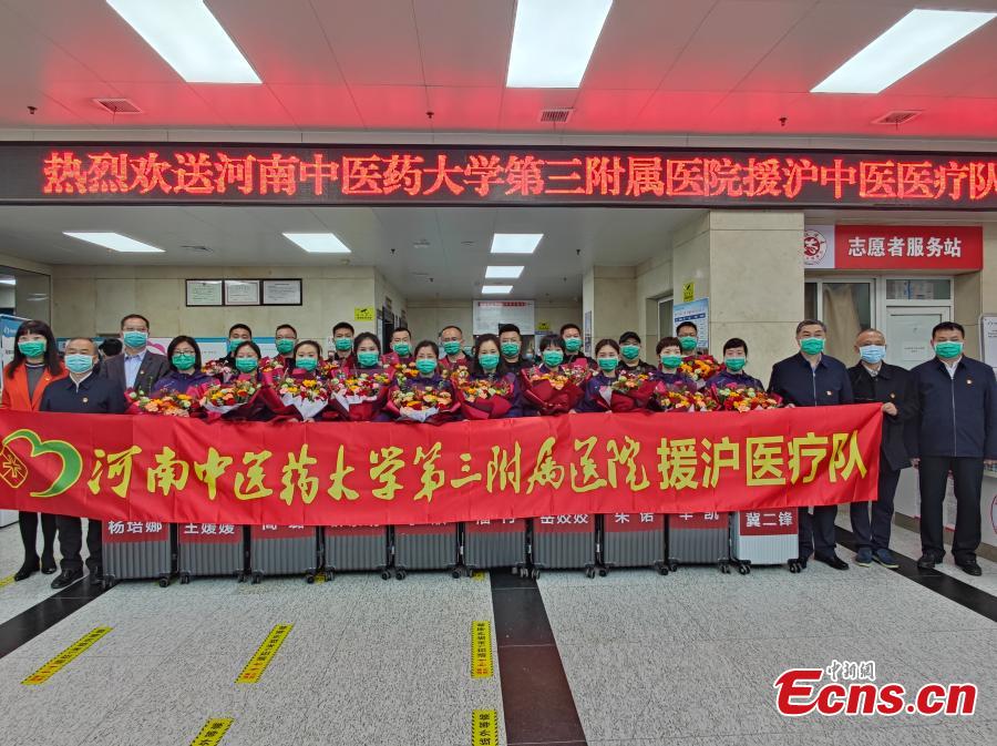 A farewell ceremony is held in Zhengzhou, central China's Henan Province, April 12, 2022. Henan sent another batch of 75 traditional Chinese medicine (TCM) medical workers to Shanghai today. (Photo: China News Service/Kan Li)