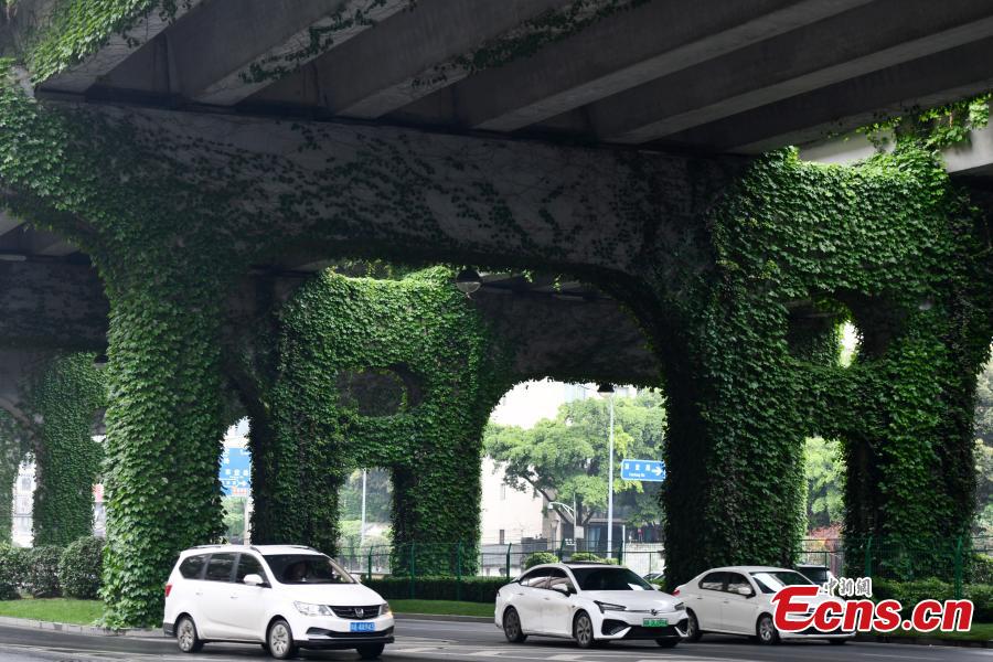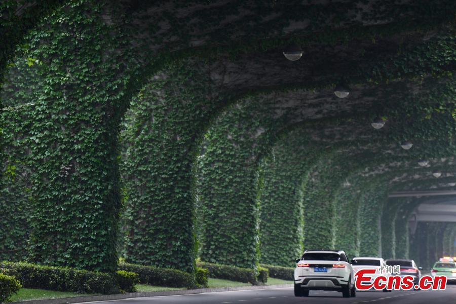 Cars run under a green overpass on the 2nd ring road, Chengdu, southwest China's Sichuan Province, April 14, 2022. Covered by flourishing ivy plants, the overpass looks like a green corridor. (Photo: China News Service/Zhang Lang)