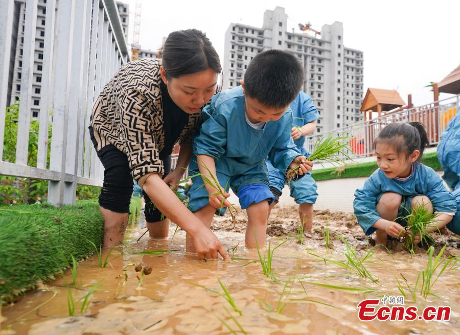Children experience transplanting rice seedlings under the guidance of teachers at a kindergarten at Xinyu, east China's Jiangxi Province, April 14, 2022. (Photo: China News Service/Zhao Chunliang)