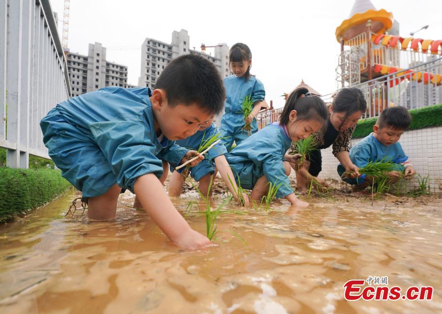 Children learn to transplant rice seedlings at a kindergarten at Xinyu, east China's Jiangxi Province, April 14, 2022. (Photo: China News Service/Zhao Chunliang)