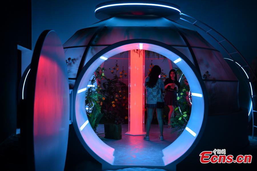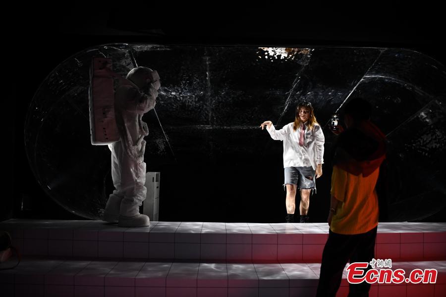 A man travels through black hole in space suit at "Bondless: Creative Art Exhibition on Chinese Aerospace" in Chengdu, southwest China's Sichuan Province, April 19, 2022. (Photo: China News Service/Zhang Lang)