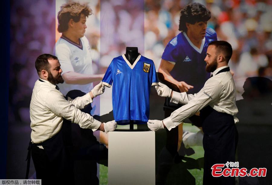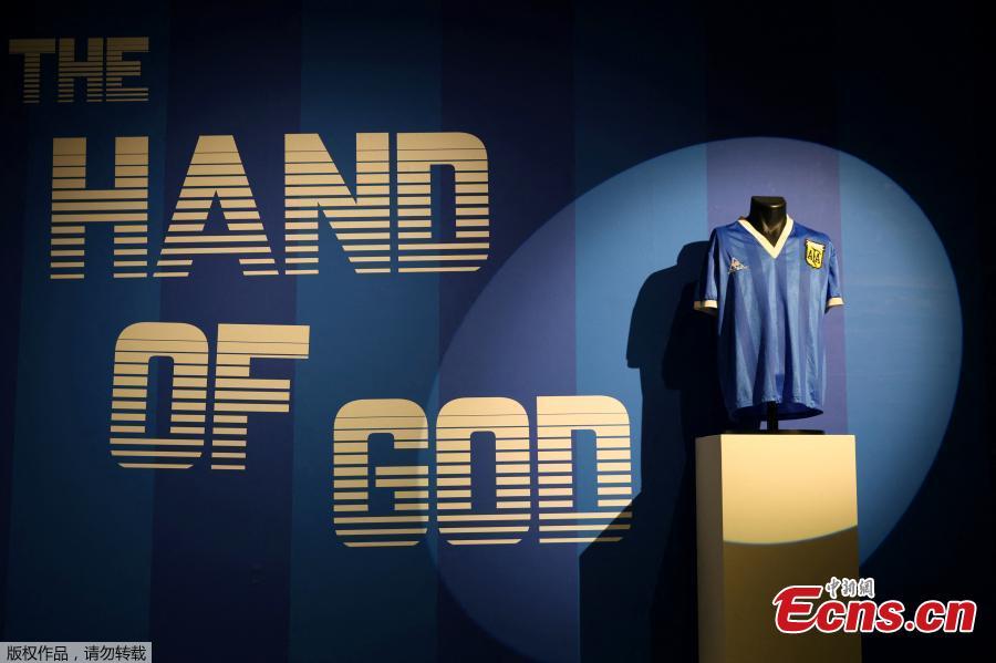 Photo shows the 1986 FIFA World Cup match shirt of Argentine soccer player Diego Maradona. An auction of the shirt worn by Diego Maradona when he scored twice against England in the 1986 World Cup, including the infamous "hand of God" goal, kicked off Wednesday with a bid of over US$5 million in London, UK, April 20, 2022. (Photo/Agencies)