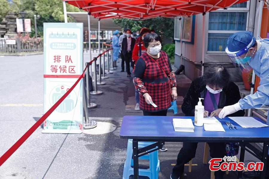 A medical worker helps fill out registration form for seniors in Fengxian District of Shanghai, April 21, 2022. Senior citizens are encouraged to get COVID-19 vaccines in Shanghai. (Photo: China News Service/Yin Liqin)