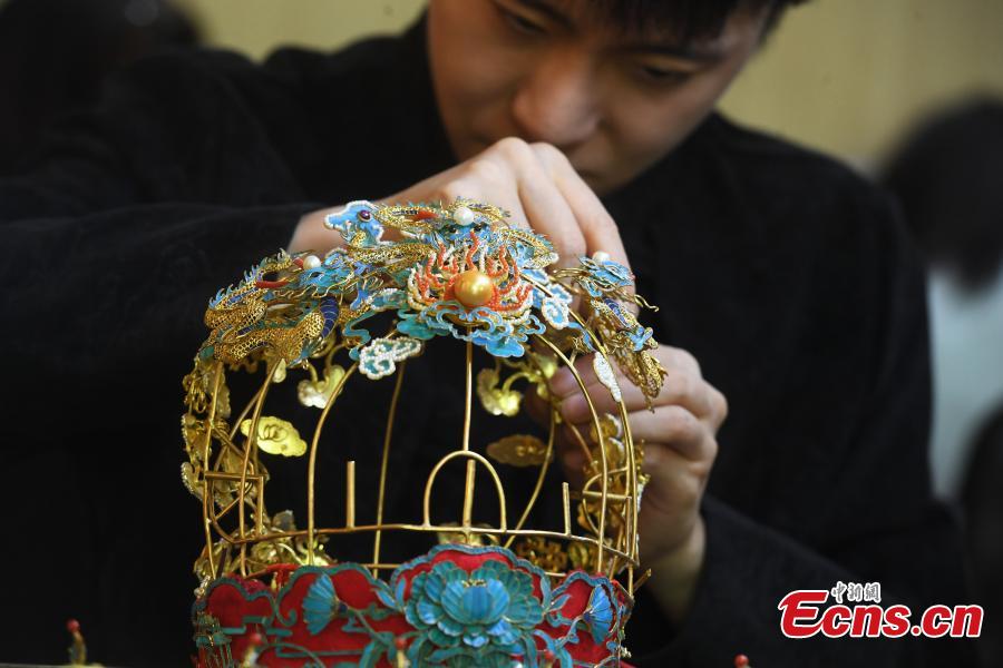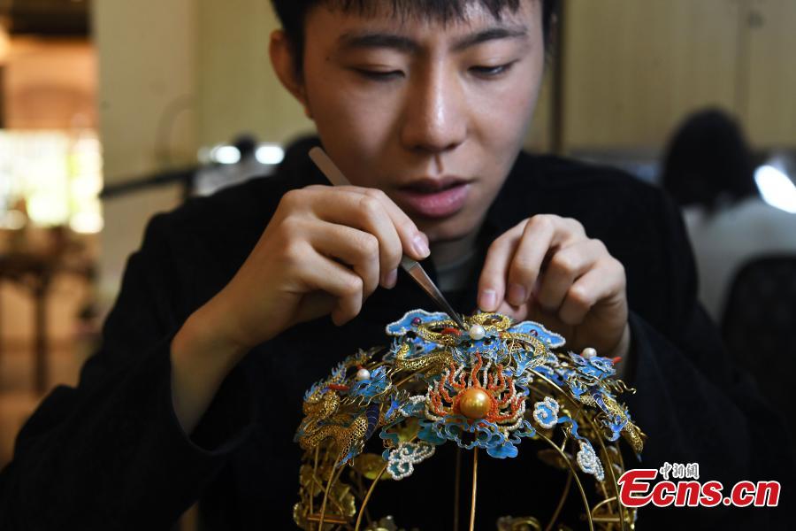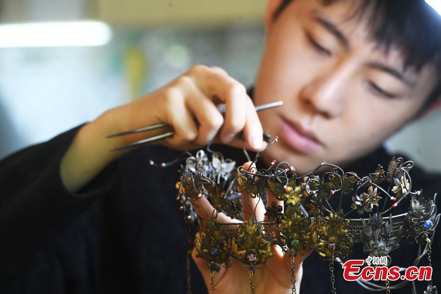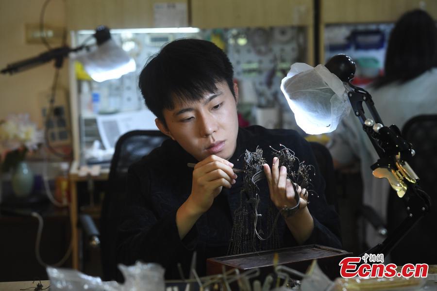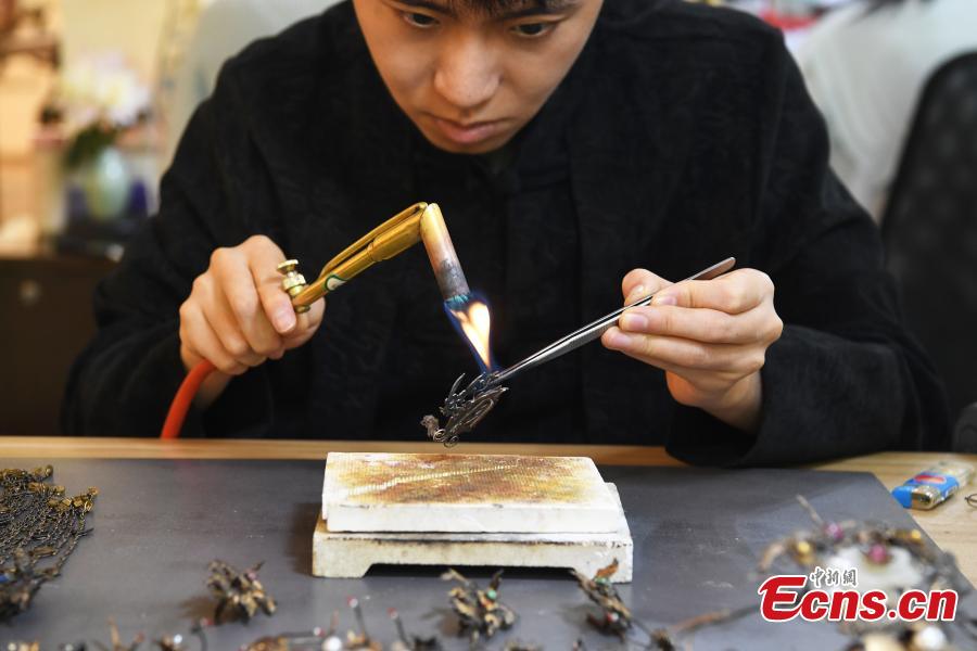 Gu Guoqiang, a post-90s young man makes ornaments with filigree inlay techniques in Chongqing, April 21, 2022. (Photo: China News Service/Chen Chao)