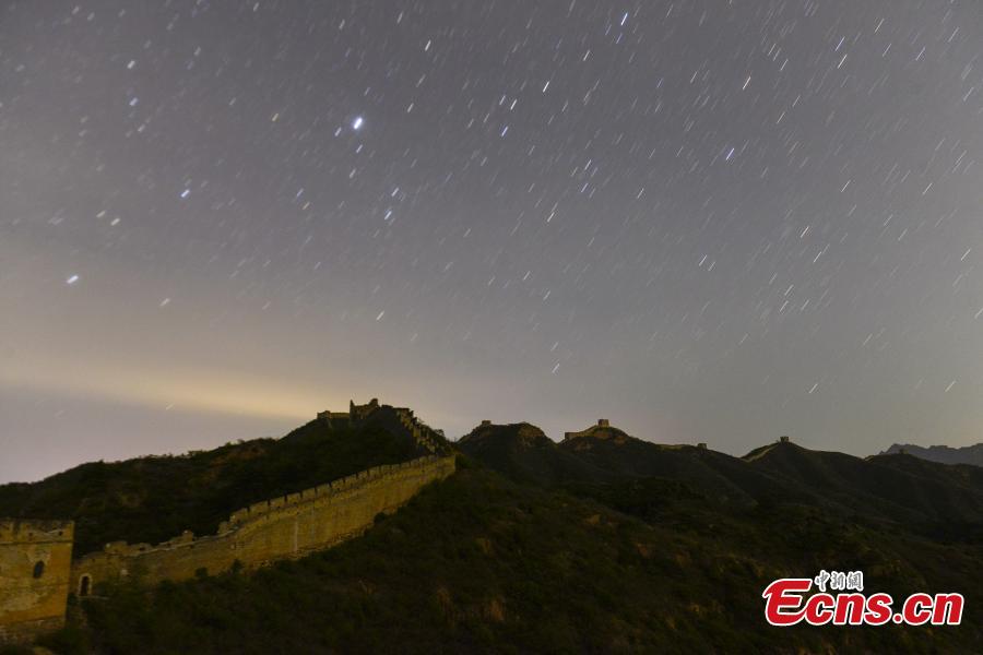 The Lyrid meteor shower lights up the sky over the Jinshanling Great Wall in Luanping County, north China's Hebei Province, April 23, 2022. As one of the first major meteor showers of spring, Lyrid meteor shower has been active since April 15 and goes to the 29th. (Photo/VCG)