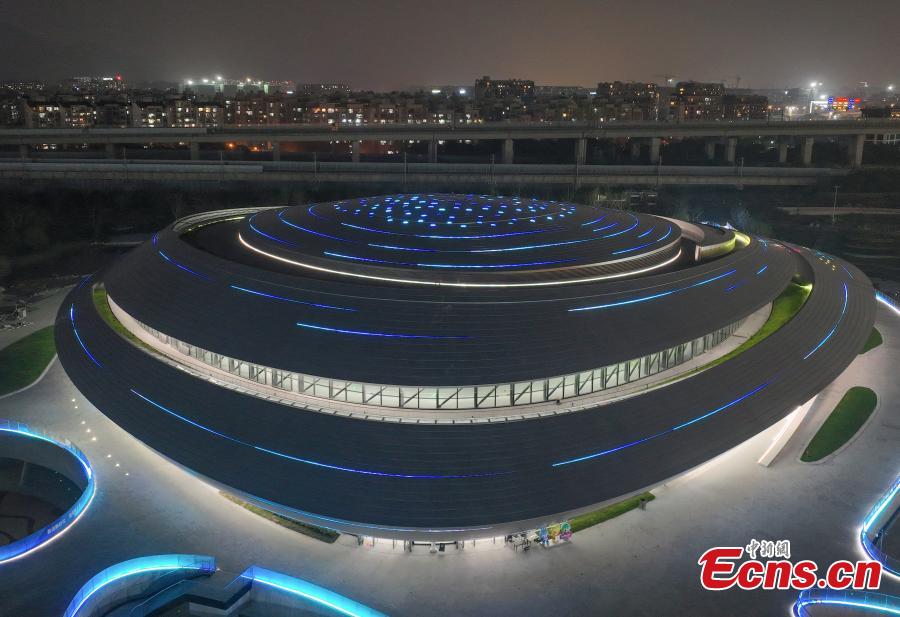 Aerial photo shows night view of China Hangzhou Esports Center, a venue of the 19th Asian Games Hangzhou 2022 in Hangzhou, east China's Zhejiang Province, April 24, 2022. The 19th Asian Games will be held in Hangzhou from September 10 to 25. (Photo: China News Service/Wang Gang)