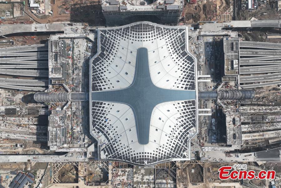 Aerial photo of photovoltaic modules on the roof of Hangzhou West Railway Station, Hangzhou, east China's Zhejiang Province, April 24, 2022. (Photo: China News Service/Wang Gang)
