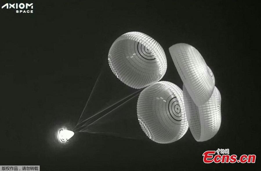 The SpaceX Dragon capsule deploys parachutes as it descends to the Atlantic Ocean off the Florida, the United States, April 25, 2022. (Photo/Agencies)