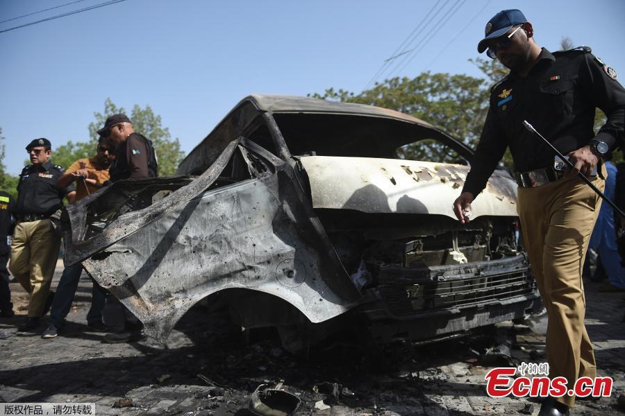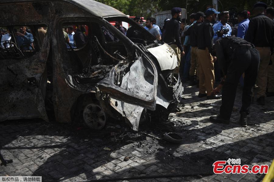 Pakistani police officers and investigators examine a burned van at the site of explosion in Karachi, Pakistan, April 26, 2022. (Photo/Agencies)