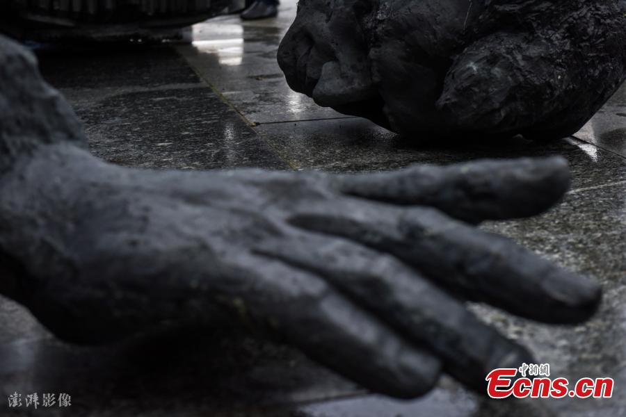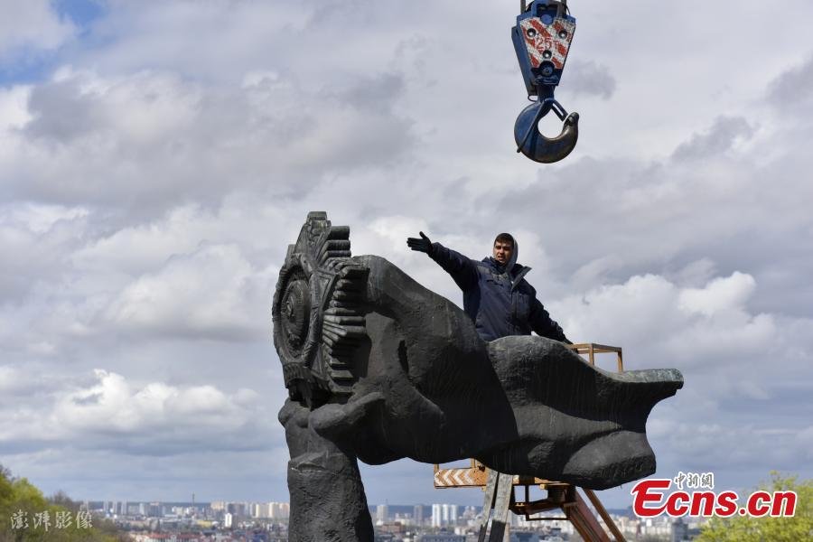 A Soviet monument to a friendship between Ukrainian and Russian nations is seen during its demolition in Kyiv, Ukraine, April 26, 2022. (Photo/ICphoto)