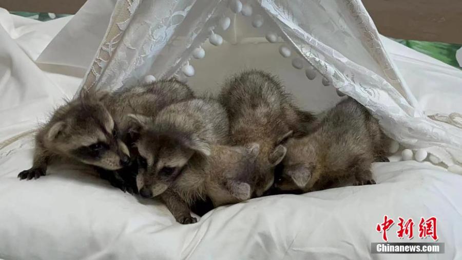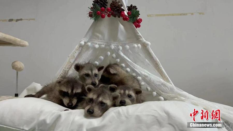 Photo shows the sextuplets of baby raccoons born in Haichang Ocean Park, Wuhan central China's Hubei Province. Mother raccoon Wang Yue (Gazing at Moon) gave birth to quadruplets in 2020 and sextuplets in 2022. The six baby raccoons are in good health. (Photo: China News Service/Chen Ting)