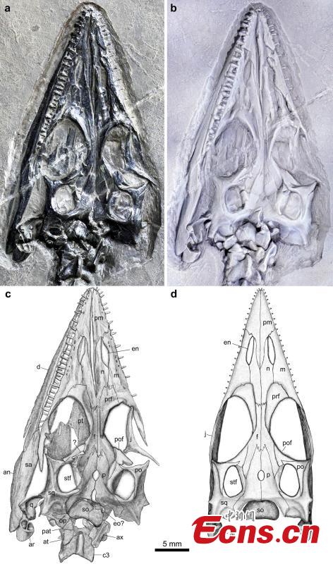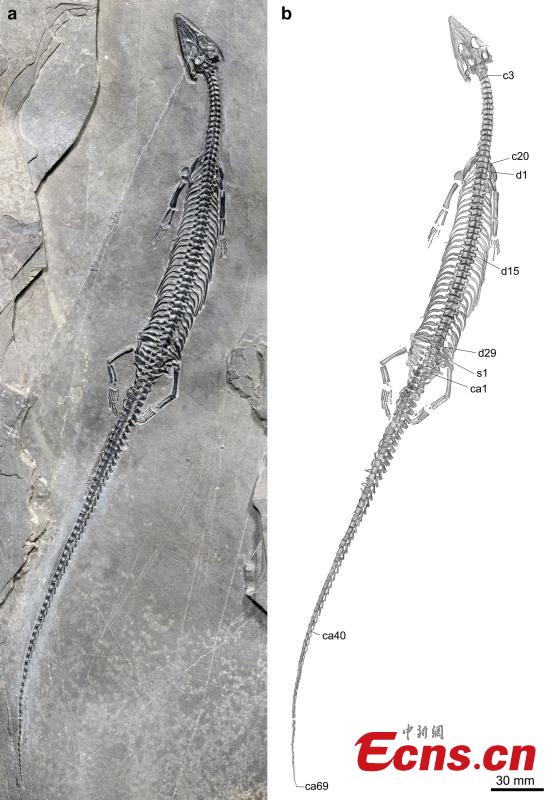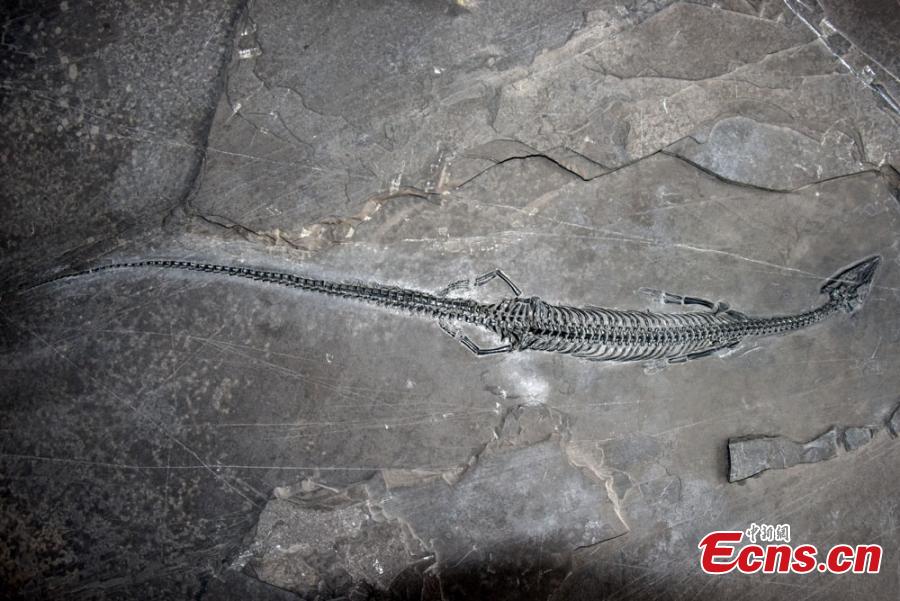 A fossil of a marine reptile called Honghesaurus dating back 244 million years is on display, May 9, 2022. (Photo: China News Service/Sun Zifa)
