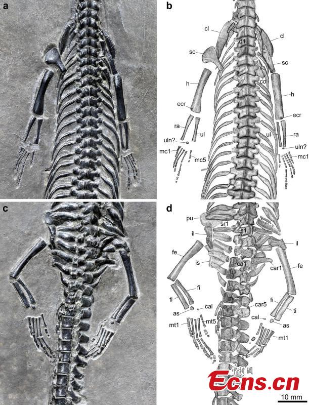 Line-drawing of girdles, limbs and vertebrae of Honghesaurus. (Photo provided to China News Service)