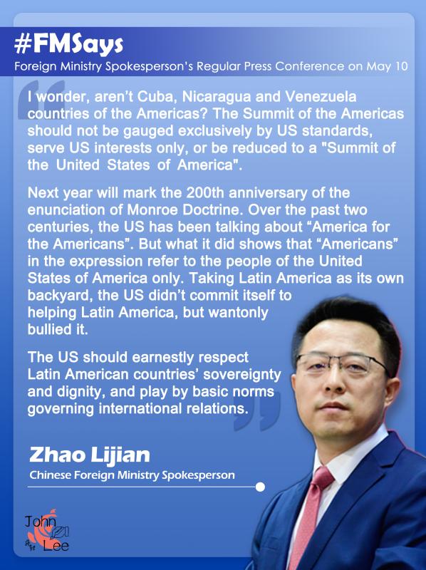 The Summit of the Americas cannot simply serve U.S. self-interest, a Chinese foreign ministry spokesperson said Tuesday, urging the United States to respect the sovereignty and dignity of Latin American countries.