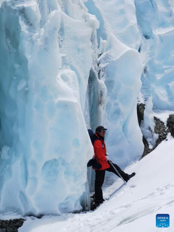 Photo taken with a mobile phone shows a member of the glacier and pollutant research team working at the East Rongbuk glacier on Mount Qomolangma, May 5, 2022. The new comprehensive scientific expedition on Mount Qomolangma, as part of China's second scientific research survey of the Qinghai-Tibet Plateau, is the country's first scientific research above an altitude of 8,000 meters on the peak.