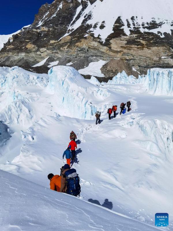 Photo taken with a mobile phone shows members of the glacier and pollutant research team walking past the East Rongbuk glacier on Mount Qomolangma, May 7, 2022. The new comprehensive scientific expedition on Mount Qomolangma, as part of China's second scientific research survey of the Qinghai-Tibet Plateau, is the country's first scientific research above an altitude of 8,000 meters on the peak.