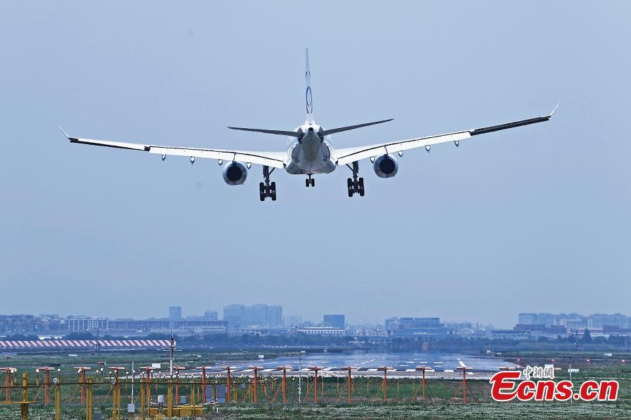 A China Eastern Airbus A330 passenger plane prepares for landing on the runway during a flight training at the Shanghai Hongqiao International Airport, east China's Shanghai, May 16, 2022. (Photo: China News Service/Yin Liqin)