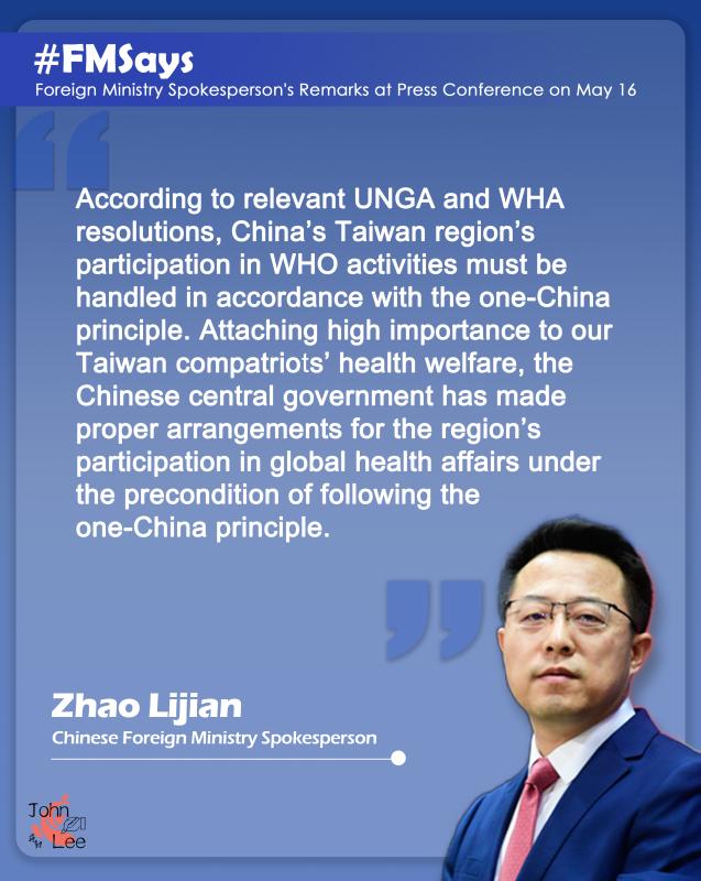 China rejects and deplores it that the United States should insist on signing the bill, which will help Taiwan regain observer status in the World Health Organization (WHO), into law, a foreign ministry spokesperson said on Monday, urging the U.S. to handle Taiwan-related issues prudently and properly.