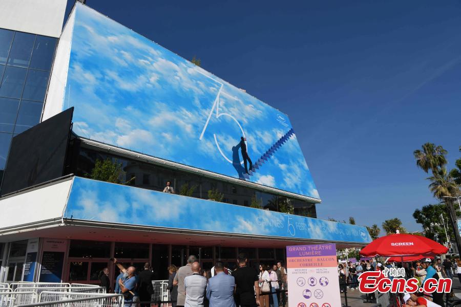 Staff members prepare for the 75th Cannes Film Festival in Cannes, southern France, May 17, 2022. (Photo: China News Service/Li Yang)