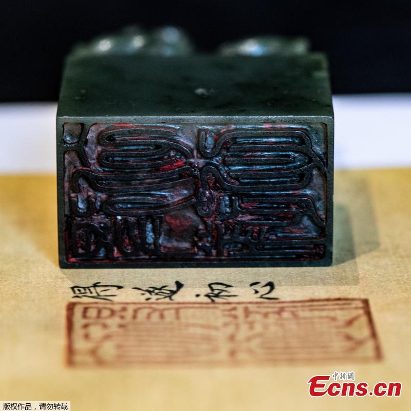 A Chinese imperial seal of the Qianlong era (1711 - 1799) is on display ahead of its auction at Sotheby's auction house, Paris, France, May 19, 2022. The seal is scheduled to be auctioned on June 16, 2022, at the auction house with an estimated of between 100,000-150,000 Euros. (Photo/Agencies)