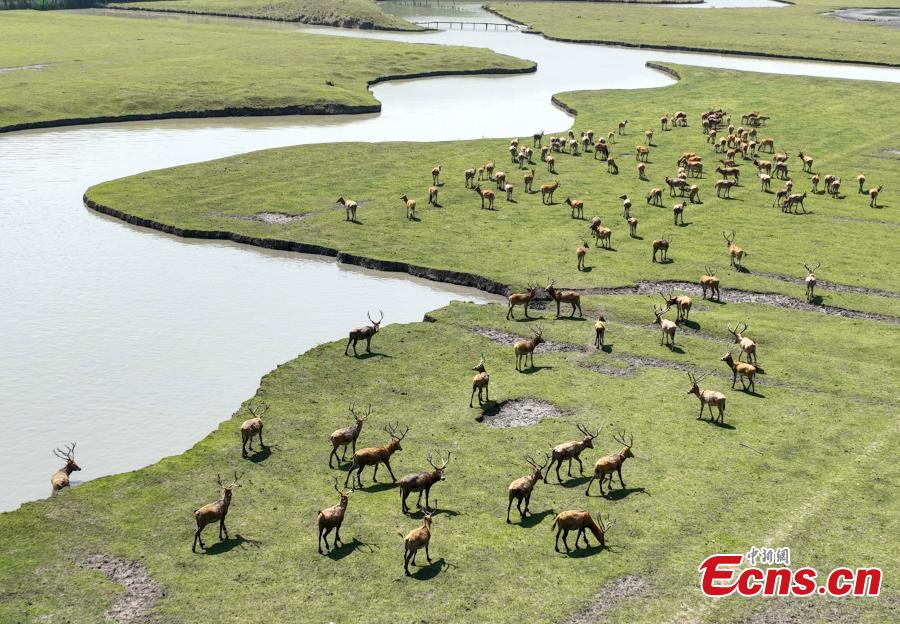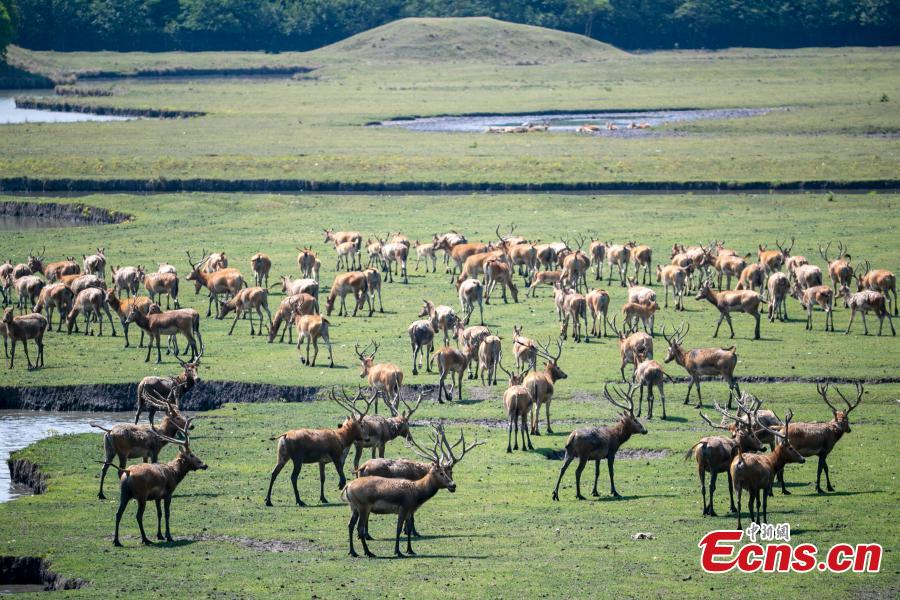 A herd of milu deer wander at Qinhu National Wetland Park, east China's Jiangsu Province, May 22, 2022. Milu deer, also known as Pere David's deer, are endemic to China where they bear the nickname "sibuxiang," or "like none of the four" due to their unique features - a horse's face, a donkey's tail, cow-like hooves and a stag's antlers. (Photo provided to China News Service)