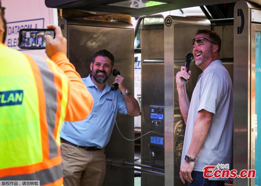 Workers pose with the last public payphone before its removal near Times Square in New York City, U.S., May 23, 2022. (Photo/Agencies)