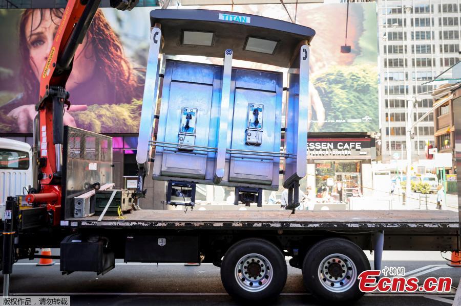Workers remove the last public payphone near Times Square in New York City, U.S., May 23, 2022., marking what officials called "the end of the pay phone era." (Photo/Agencies)
