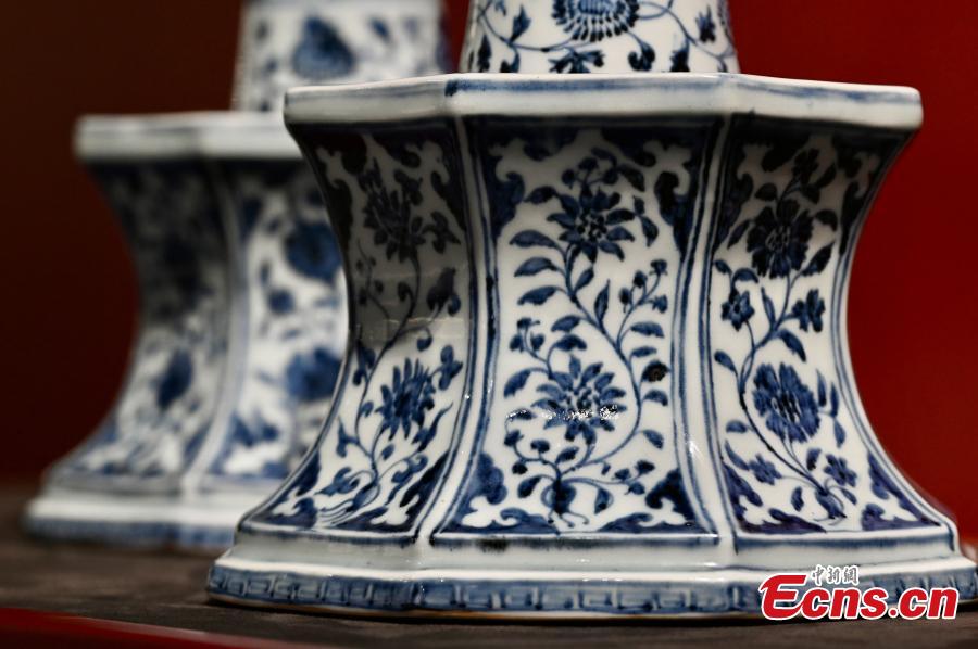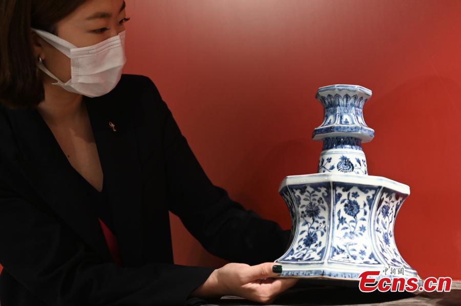 An exquisite pair of blue-and-white octagonal "floral" candlesticks from the Ming dynasty (1368?1644) Yongle period (r.1403?1424) are on display during a media preview at Bonham's, the Hong Kong Special Administrative Region, May 24, 2022. (Photo: China News Service/Li Zhihua)