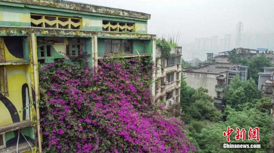 A view of a floral waterfall of blooming bougainvillea flowing down the side of an eight-storey residential building in Chongqing, May 25, 2022. (Photo: China News Service/Jiang Hangjia)
