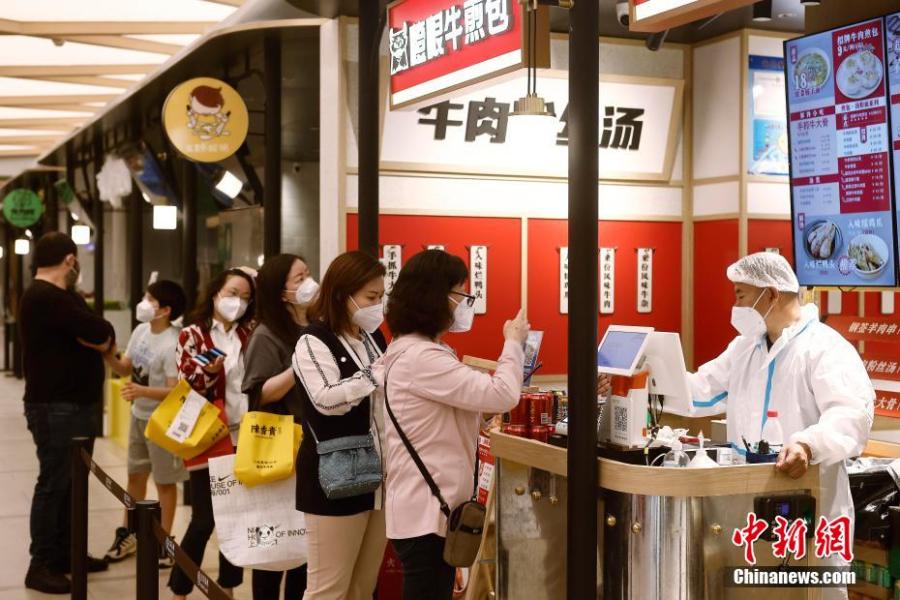 People line up to make orders at a food court in a shopping mall in Putuo district, Shanghai, May 26, 2022. (Photo: China News Service/Yin Liqin)