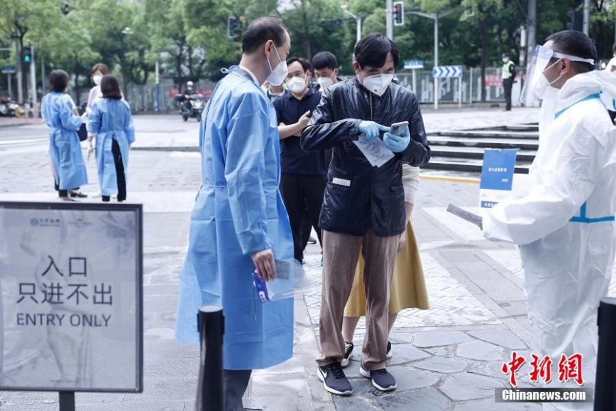 Staff members check people's health codes at the entrance of a shopping mall in Putuo district, Shanghai, May 26, 2022. (Photo: China News Service/Yin Liqin)