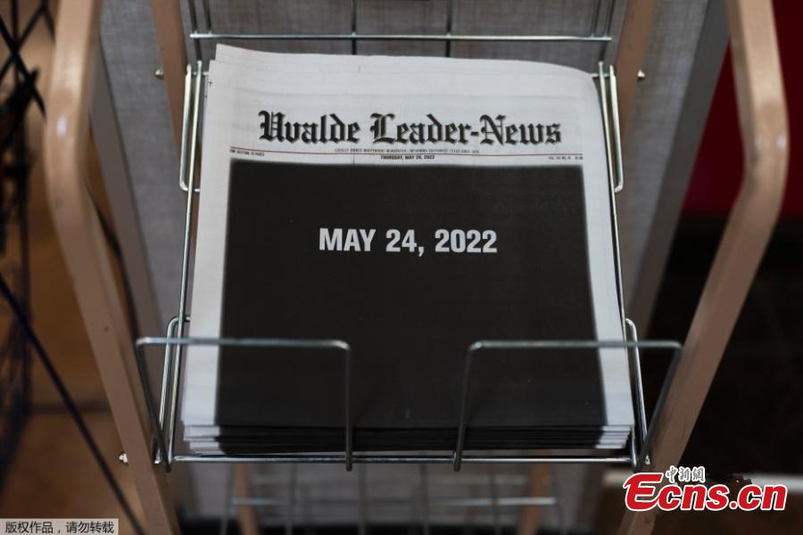 Copies of the Uvalde Leader-News with a black front page showing the date of the Robb Elementary School shooting that left 19 students and two teachers dead. are seen at a market in Uvalde, Texas, U.S., May 26, 2022. (Photo/Agencies)