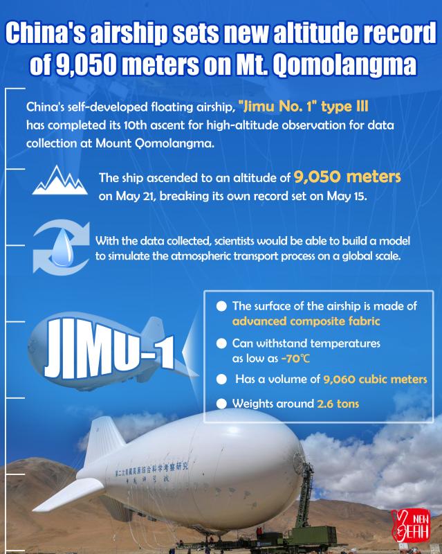 China's self-developed floating airship, "Jimu No. 1" type III has completed its 10th ascent for high-altitude observation on May 26 for data collection at Mount Qomolangma.