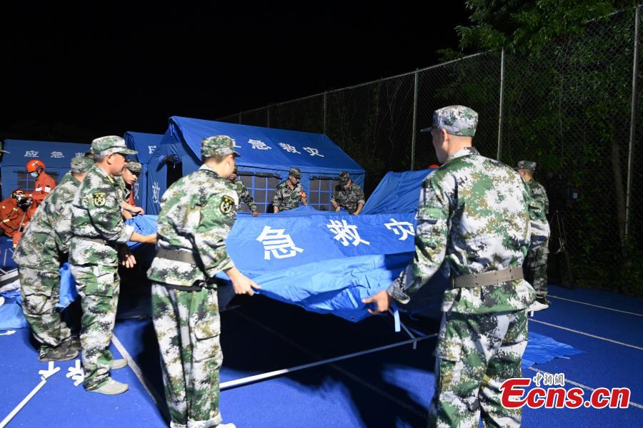 Rescuers put up tents at a temporary shelter in Lushan County of Ya'an, southwest China's Sichuan Province, June 1, 2022. (Photo: China News Service/An Yuan)