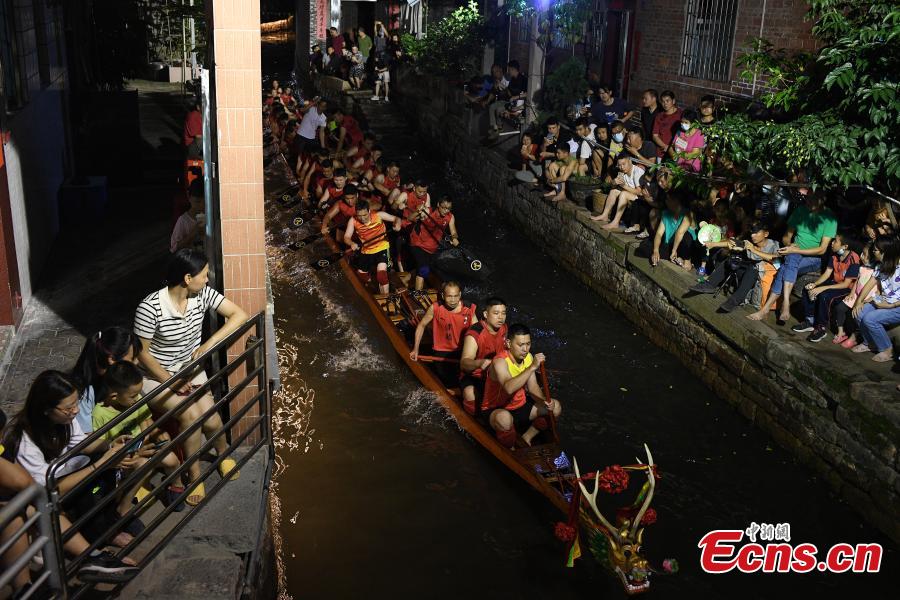 People take part in night training of Diejiao dragon boat drifting to greet the upcoming Dragon Boat Festival or Duanwu Festival in Foshan, south China's Guangdong Province, June 1, 2022. (Photo: China News Service/Chen Chuhong)
