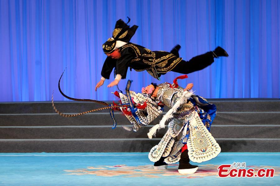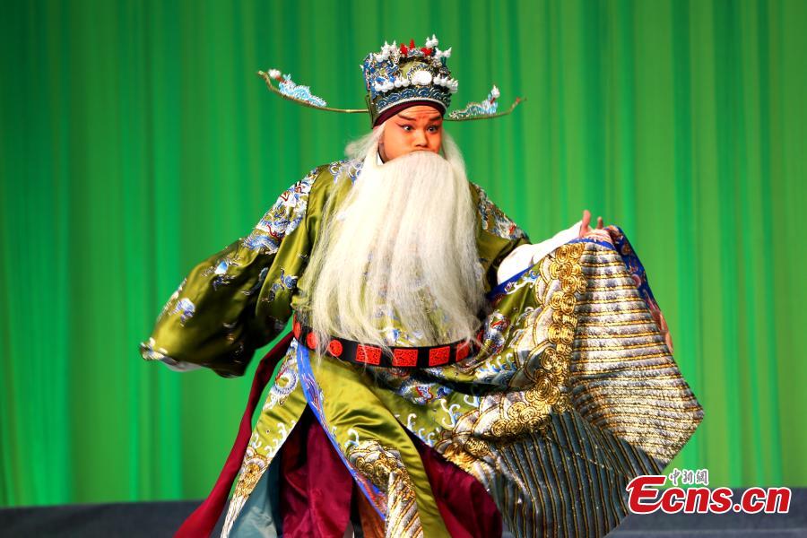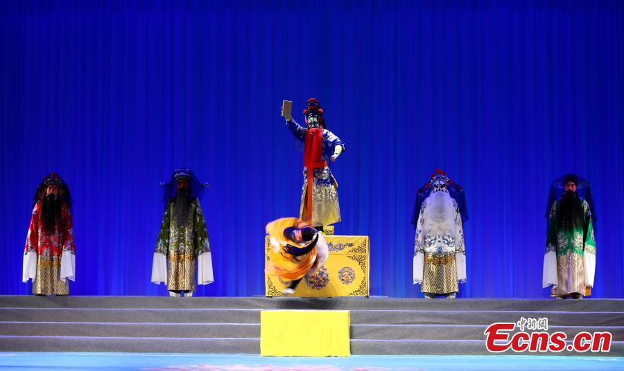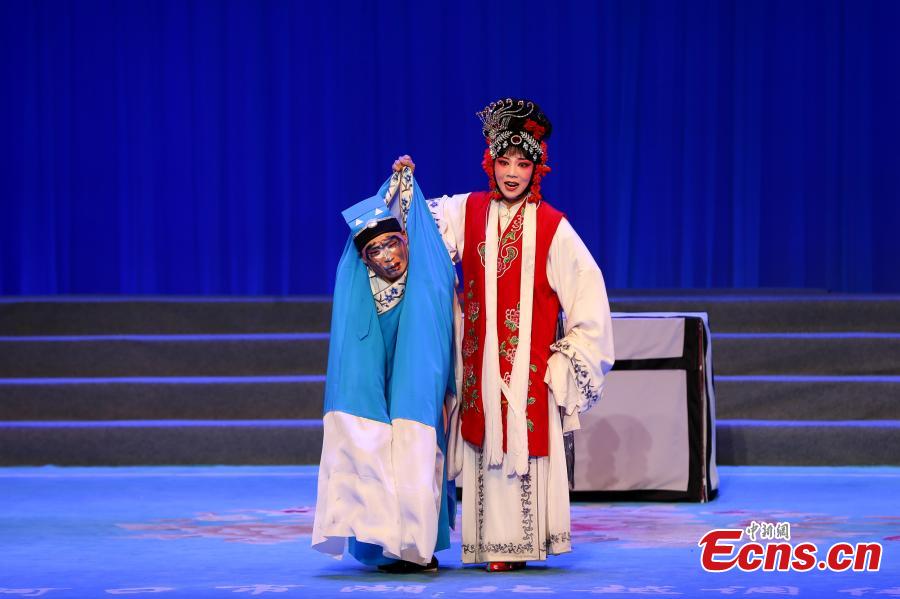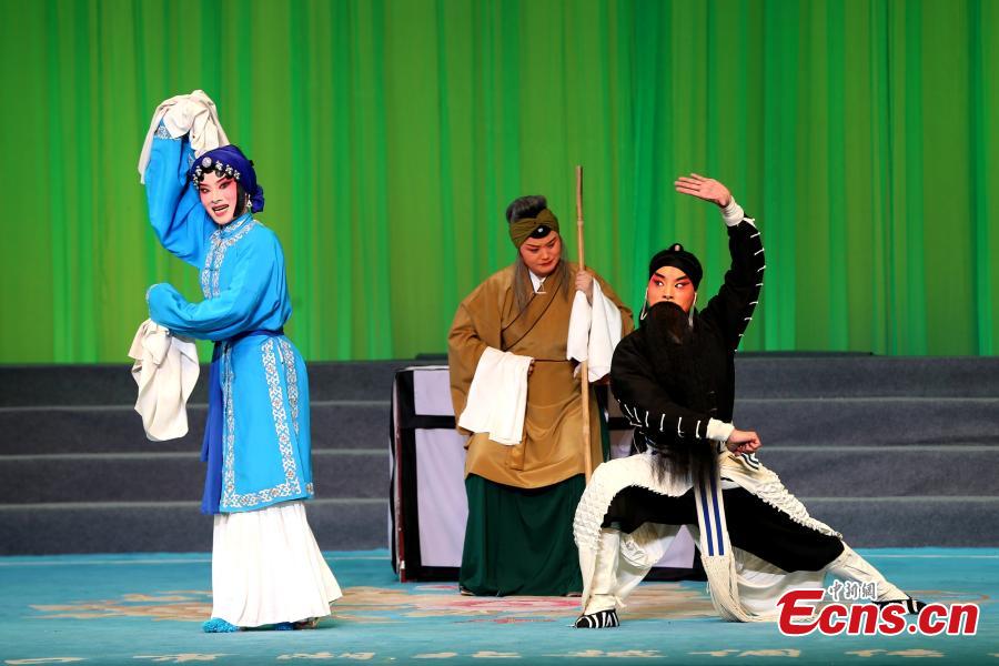 Actors welcome China’s Cultural and Natural Heritage Day which falls on June 11 this year by performing Yuediao Zhezi Opera, a kind of Chinese opera native to Hubei Province, at the Xiangyang Theater, Hubei Province, June 9, 2022. (Photo/China News Service)