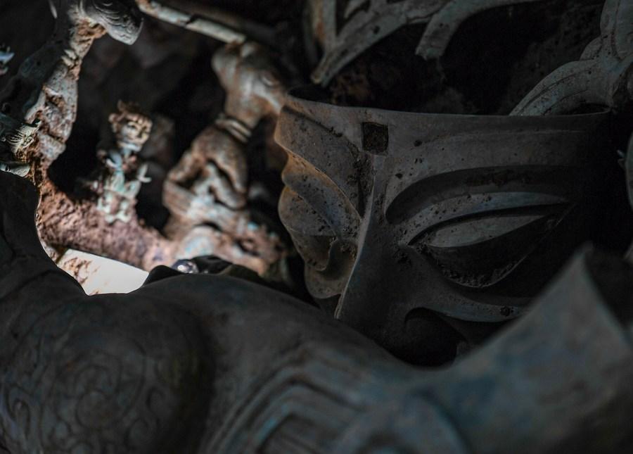 Photo taken on June 1, 2022 shows artifacts excavated from the No.8 sacrificial pit at Sanxingdui Ruins site in southwest China's Sichuan Province. (Xinhua/Shen Bohan)