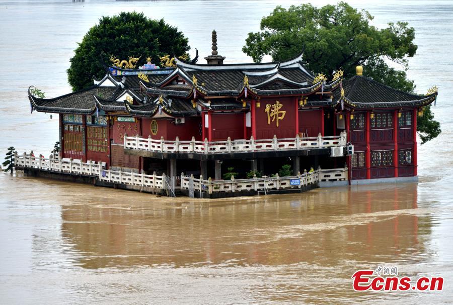 The Jinshan Temple is flooded by the rising Wulongjiang River water in Fuzhou, Fujian Province, June 14, 2022. (Photo: China News Service/Zhang Bin)