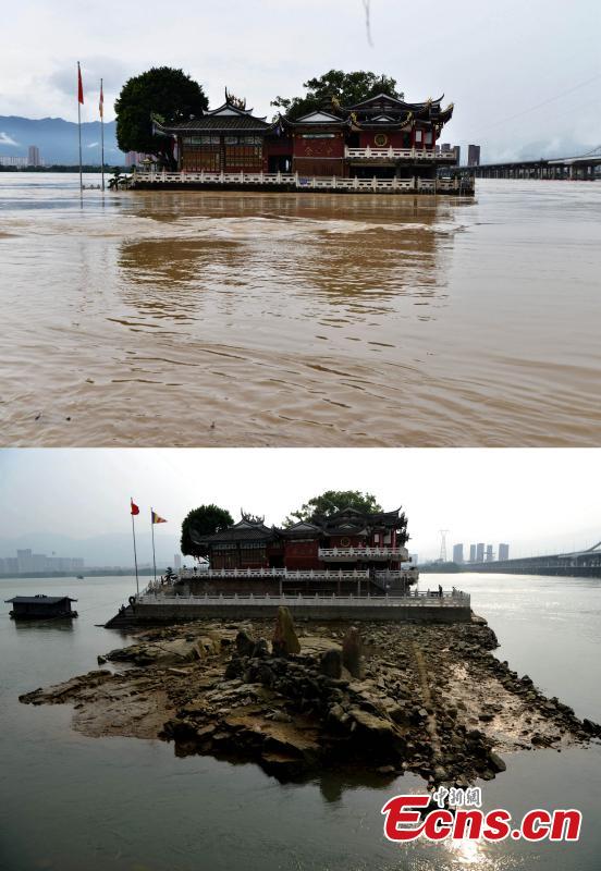 Combo photo shows the Jinshan Temple surrounded by floodwater (Uper) and before the flood in Fuzhou, Fujian Province, June 14, 2022. (Photo: China News Service/Zhang Bin)