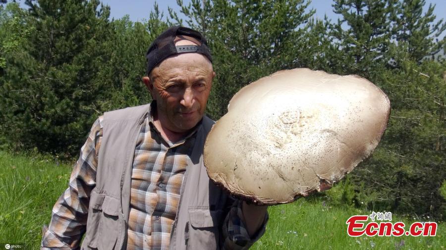 A farmer shows the giant mushroom emerged after a long-lasting downpour in Kars, Turkey, June 19, 2022. (Photo/ICphoto)