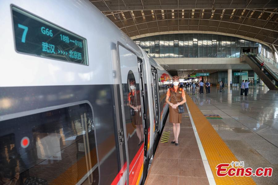 Train attendants welcome passengers on the platform at the Wuhan railway station to Beijing in Wuhan, central China's Hubei Province, June 20, 2022. (Photo: China News Service/Zhang Chang)